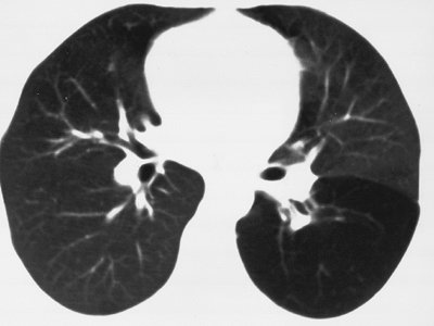 CT of a 30-year-old asymptomatic woman shows abnormal lucency and