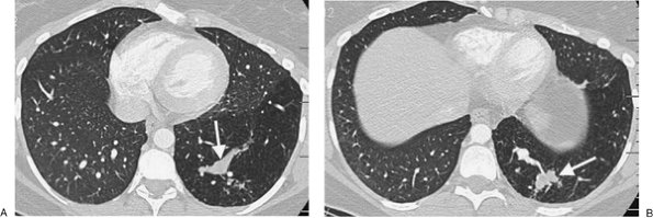 FIGURE 16-2. Intralobar sequestration. A: CT of a 37-year-old woman with chest pain shows a prominent tubular structure in the left lower lobe (arrow). The surrounding lung, also part of the sequestration, is hyperlucent. B: CT at a more inferior level shows the tubular structure leading to a lobulated mass (arrow) in the left lower lobe. C: CT with mediastinal windowing shows the tubular structure be a vessel (arrow). D: CT of the upper abdomen shows a prominent vessel (arrow) arising from the abdominal aorta and heading toward the left lower lobe. E: Coronal reformatted CT confirms that a vessel arises from the abdominal aorta (arrow) and heads superiorly toward the left lower lobe. F: Paddlewheel reformatted CT shows drainage from the left lower lobe mass to the left inferior pulmonary vein (arrow). |