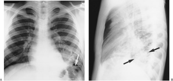 FIGURE 16-6. Pulmonary venolobar syndrome. A: PA chest radiograph of an 11-year-old girl shows a curvilinear band of opacification (arrows)