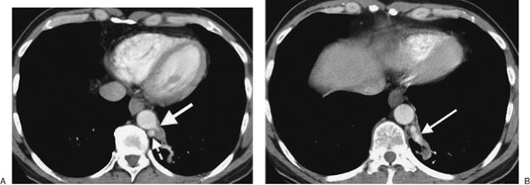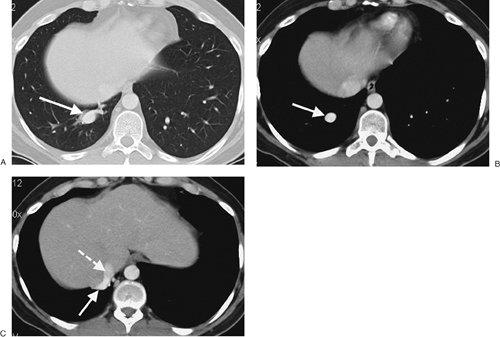 FIGURE 16-8. Anomalous pulmonary venous return. A: CT shows a large tubular structure in the right lower lobe (arrow). B: CT with mediastinal windowing shows enhancement of the structure (arrow), confirming its vascular nature. C: CT at a level inferior to (B) shows the vascular structure (solid arrow) draining into the inferior vena cava (dashed arrow). |