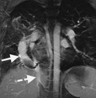 FIGURE 16-5. Pulmonary venolobar syndrome. MRI of a 24-year-old man shows a large venous structure (solid arrow) draining into the abdominal inferior vena cava (dashed arrow). |