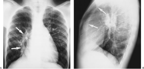 clearly seen on this view. B: Lateral view shows a retrosternal band of opacification (arrows),