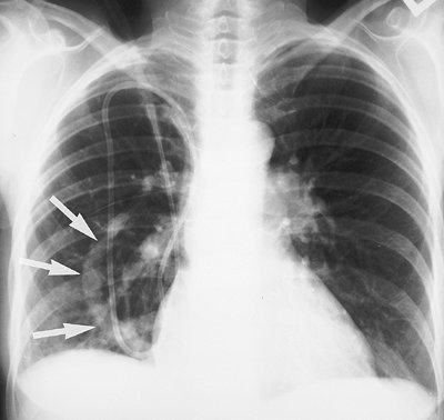 FIGURE 16-7. Pulmonary venolobar syndrome. PA chest radiograph of a 56-year-old woman shows the anomalous draining vein (scimitar; arrows), diminutive right pulmonary artery, and relatively small right lung. |