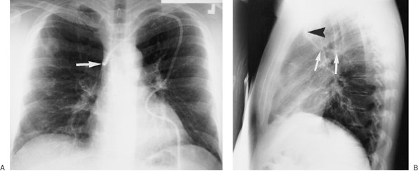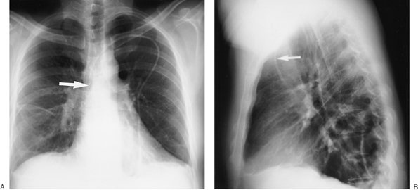 FIGURE 5-2. Azygos vein placement of central venous catheter. A: PA chest radiograph shows that the catheter tip is positioned over the expected area of the SVC. The tip is seen on end (arrow), however, which is a clue to azygos vein placement. The SVC is joined by the azygos vein posteriorly. B: Lateral chest radiograph shows the catheter coursing posteriorly, along the expected course of the azygos vein (arrows). Note how the more proximal portion of the catheter curves anteriorly (arrowhead), confirming placement from the left. |