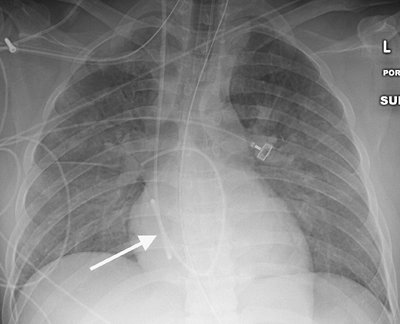 AP chest radiograph shows the radiopaque tip of an intra-aortic balloon