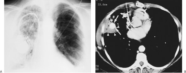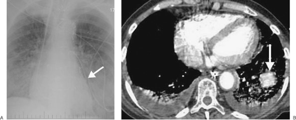 precatheterization radiograph. B: CT scan obtained after administration of intravenous contrast material, performed the same day as the chest radiograph in (A), shows an enhancing peripheral pulmonary artery pseudoaneurysm (arrows), with surrounding pulmonary hemorrhage (arrowheads). The pseudoaneurysm was embolized with coils by interventional radiologists, and the bleeding stopped. |
