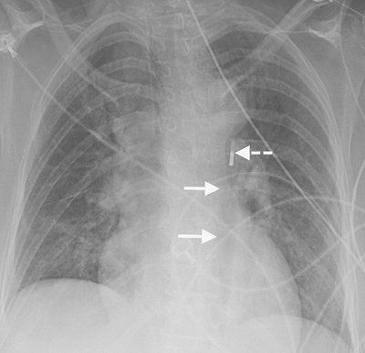 FIGURE 5-14. Inflated balloon of intra-aortic balloon pump. AP chest radiograph shows the radiopaque tip of an intra-aortic balloon pump (dashed arrow) and its radiolucent air-filled balloon (solid arrows).