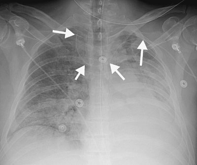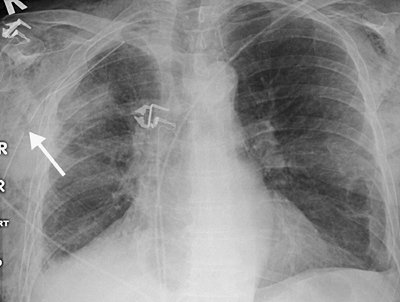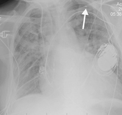 is outside of the pleural space. Note bilateral subcutaneous emphysema,