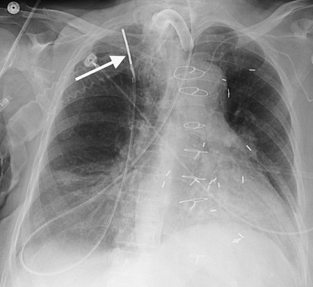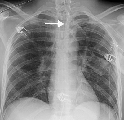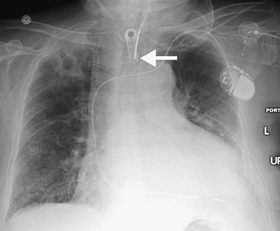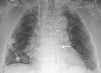 Posteroanterior (PA) chest radiograph shows the catheter entering the