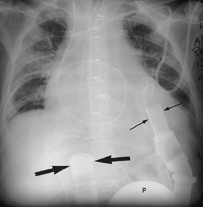 FIGURE 5-17. Left ventricular assist device. AP recumbent chest radiograph shows the inflow cannula (small arrows) within the left ventricle and directed toward the mitral valve, the pump (P), and the radiopaque portion of the outflow cannula (large arrows).