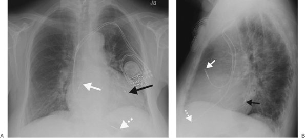 FIGURE 5-18. Biventricular pacer. PA (A) and lateral (B) chest radiographs show normal positioning of lead tips in the right atrium (solid white arrow), right ventricle (dashed white arrow), and coronary sinus (solid black arrow). |