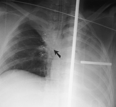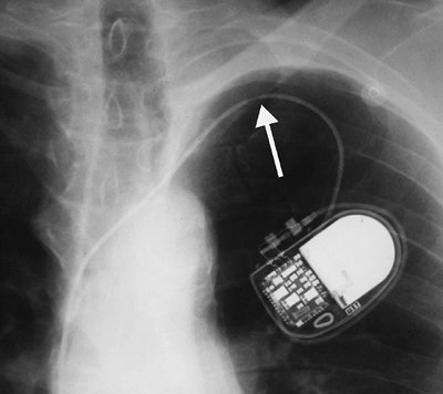 FIGURE 5-20. Fractured pacer lead. PA chest radiograph shows complete separation of lead fragments at the site of pacer lead fracture (arrow). |
