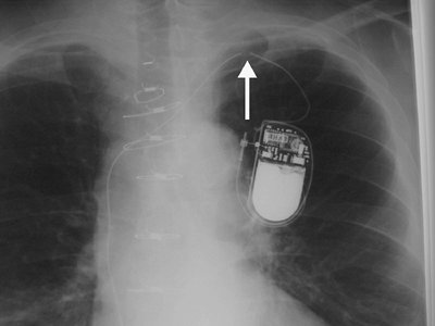 FIGURE 5-21. Fractured pacer lead. PA chest radiograph shows a fractured lead (arrow) and minimal distraction of the fracture fragments. |