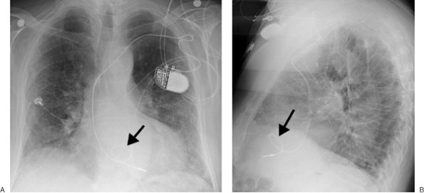FIGURE 5-22. Looped pacer lead. PA (A) and lateral (B) chest radiographs show looping of the pacer lead over the area of the expected tricuspid valve (arrow). This positioning can result in dysrhythmia, lead fracture, or myocardial perforation. |
