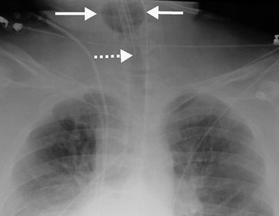 FIGURE 5-24. Overdistended endotracheal tube cuff. AP chest radiograph, coned to the neck and upper chest, shows that the tip of the ETT (dashed arrow) is above the thoracic inlet. The ETT balloon is overdistended (solid arrows). If left in this position long enough, the cuff could cause permanent damage to the vocal cords. |