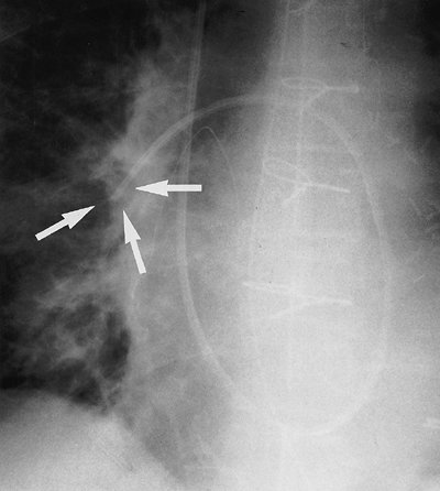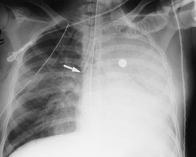FIGURE 5-27. Malpositioned chest tube. AP chest radiograph shows that the side hole of the right chest tube (arrow)