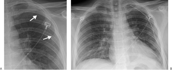 FIGURE 5-28. Chest tube track mimicking pneumothorax. A: PA chest radiograph, coned to the left upper hemithorax, shows a thin curvilinear opacity paralleling the chest wall (arrows). B: AP chest radiograph obtained 1 day earlier shows a chest tube following the course of the opacity seen in (A). |