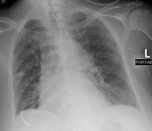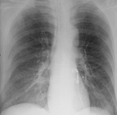AP recumbent chest radiograph in a 66-year-old woman with a history of