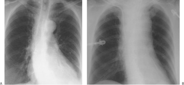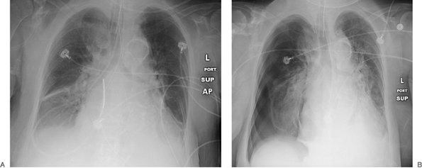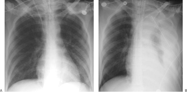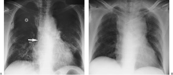 FIGURE 5-7. Mediastinal hematoma from subclavian artery perforation. A: PA chest radiograph prior to catheter placement shows a normal upper mediastinal width. B: PA chest radiograph after placement of right subclavian central venous catheter shows acute widening of the mediastinum. |