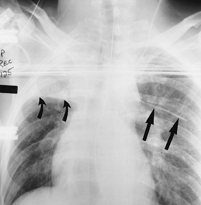 FIGURE 5-4. Malpositioned left peripherally inserted central venous catheter (PICC). AP chest radiograph shows a PICC (arrows) placed from the left side, crossing the midline, with the tip directed cephalad over the expected right jugular vein. |