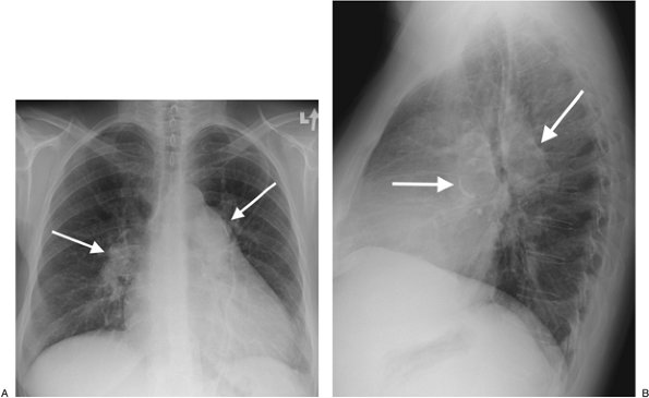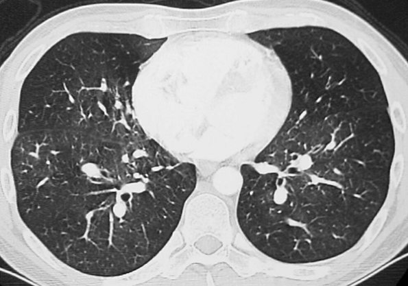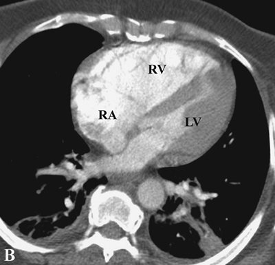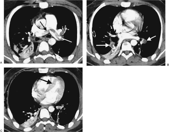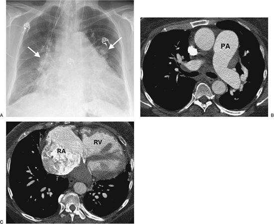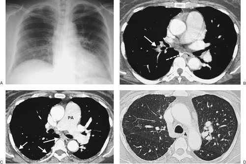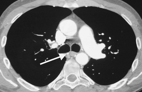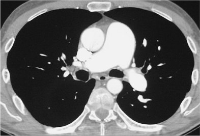 hypoattenuated areas of lung (Fig. 17-14), enlarged pulmonary arteries and right ventricle (Figs. 17-15 and 17-16), and enlarged bronchial arteries (Figs. 17-3 and 17-17).