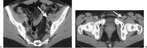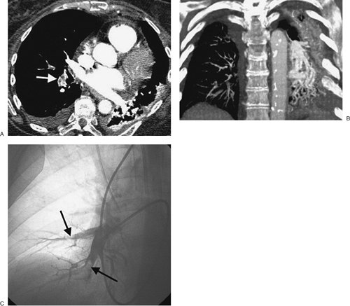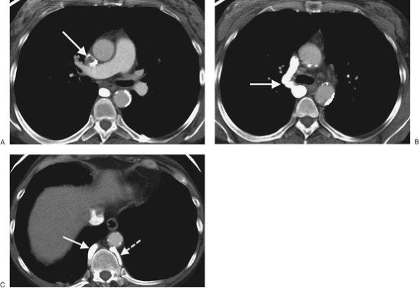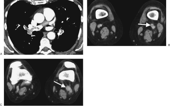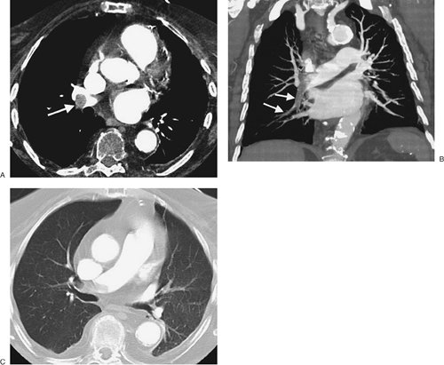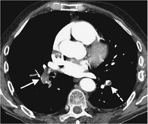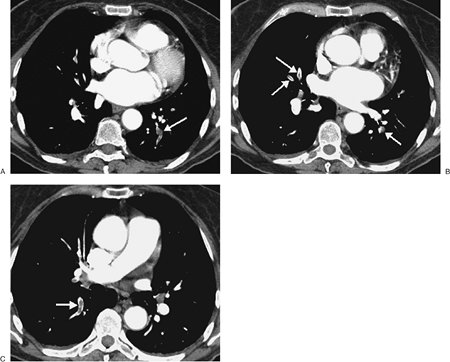 CTPA findings diagnostic of chronic PE include mural thrombus (adherent to the arterial wall), which may or may not be calcified (Fig. 17-12); webs; stenosis or strictures of the arteries (Fig. 17-13);